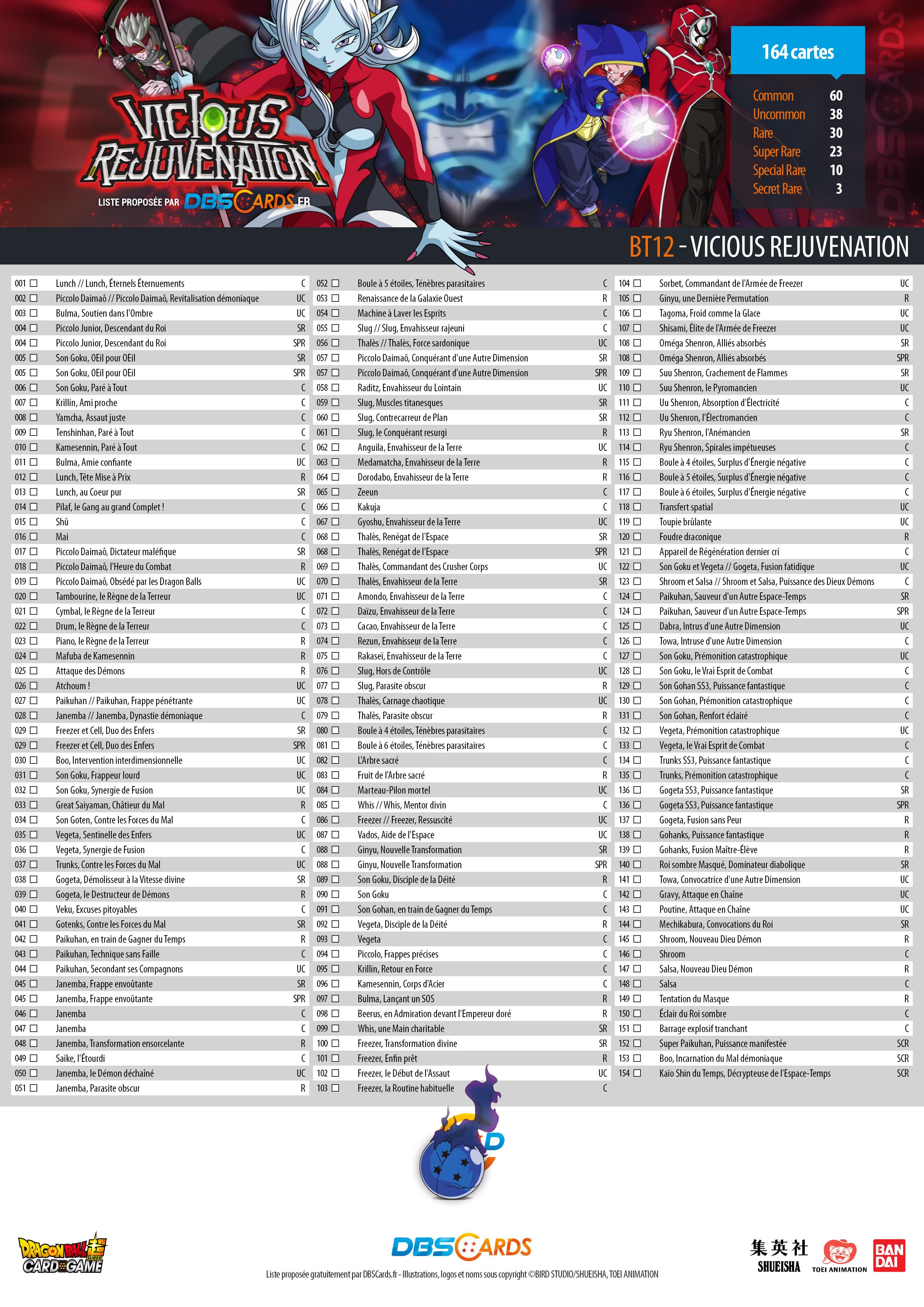Tout comme son nom anglais l'indique, la série BT12- Vicious Rajuvenate se concentre principalement autour de rajeunissements : ceux de Piccolo Daïmao, Slug ou encore Mechikabura. Elle introduit pour la première fois dans Dragon Ball Super Card Game, la Capacité Revitalisation permettant de récupérer des points de vie.